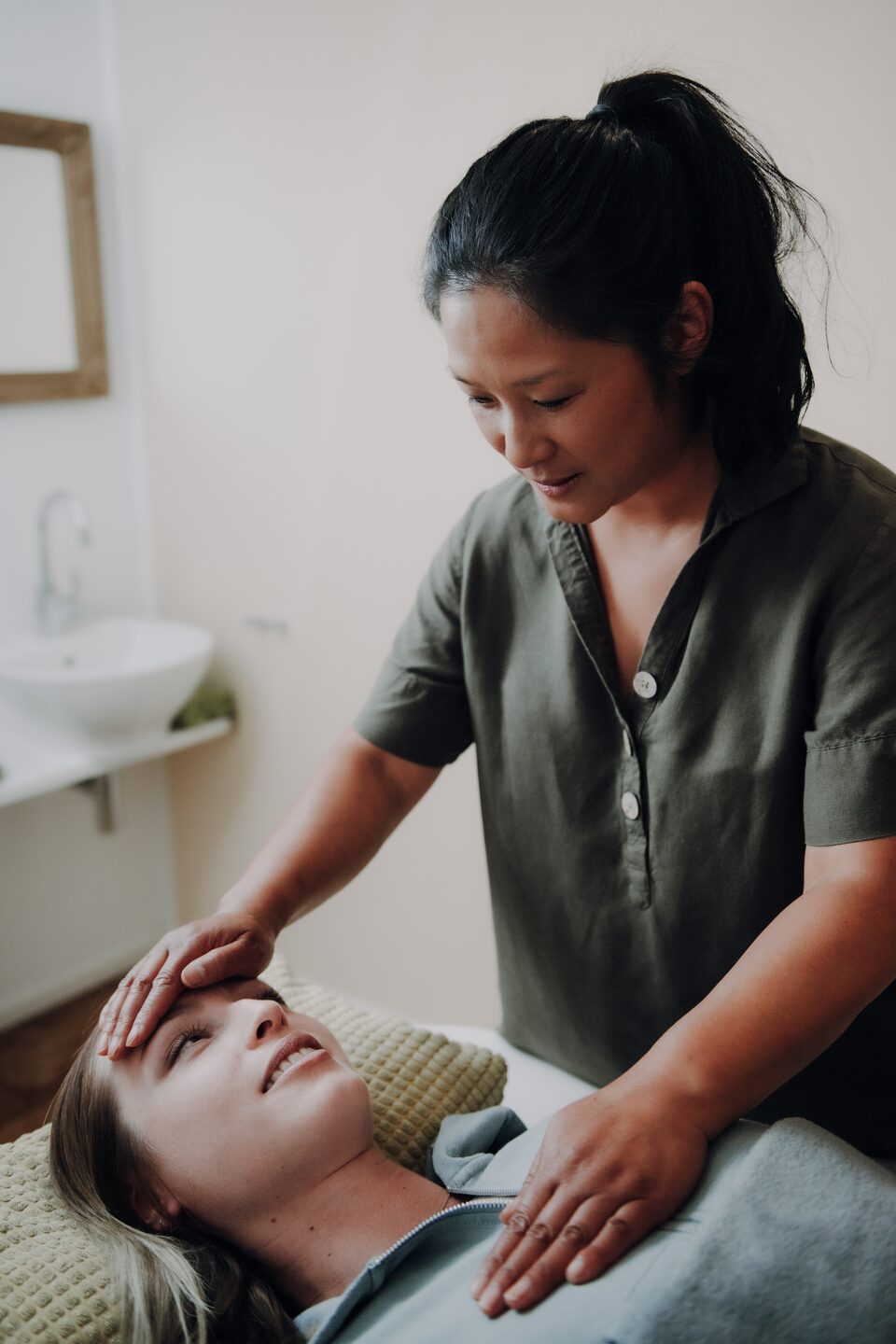 Die Behandlung findet im Liegen statt und meine Hände werden mal auf den Schultern oder auf dem Kopf, und bestimmte Bereiche des Körpers, aufgelegt.